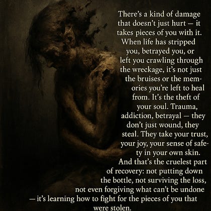 There’s a kind of damage that doesn’t just hurt — it takes pieces of you with it. When life has stripped you, betrayed you, or left you crawling through the wreckage, it’s not just the bruises or the memories you’re left to heal from. It’s the theft of your soul. Trauma, addiction, betrayal — they don’t just wound, they steal. They take your trust, your joy, your sense of safety in your own skin. And this is especially devastating when the very people who were supposed to protect you — parents, family, the ones you were told you could trust without question — are the ones who brought the dysfunction, neglect, or harm. A soul lost in that kind of betrayal is harder to reclaim because it isn’t just safety that’s been taken; it’s the blueprint for safety itself. The hands that should have caught you were the ones that dropped you, and that rewrites something deep in your bones.